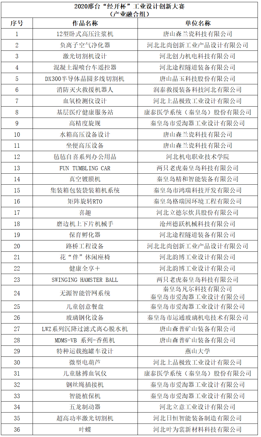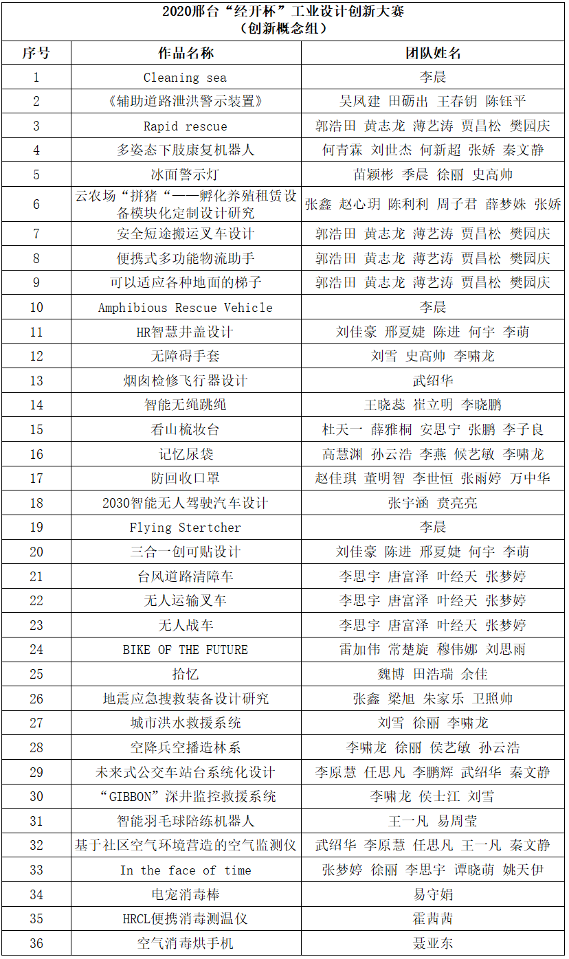 截至12月22日大賽作品征集截止日, “智造應心·創新融合” 2020邢臺“經開杯”工業設計創新大賽累計收到全省制造企業、設計機構、高等院校師生、設計師、設計愛好者等參賽者共計620件作品。依據“智造應心·創新融合” 2020邢臺“經開杯”工業設計創新大賽參賽作品評審的整體安排,評審專家進行了為期2天的集中初評,共計72個作品入圍,其中包括產業融合組和創新概念組各36件。