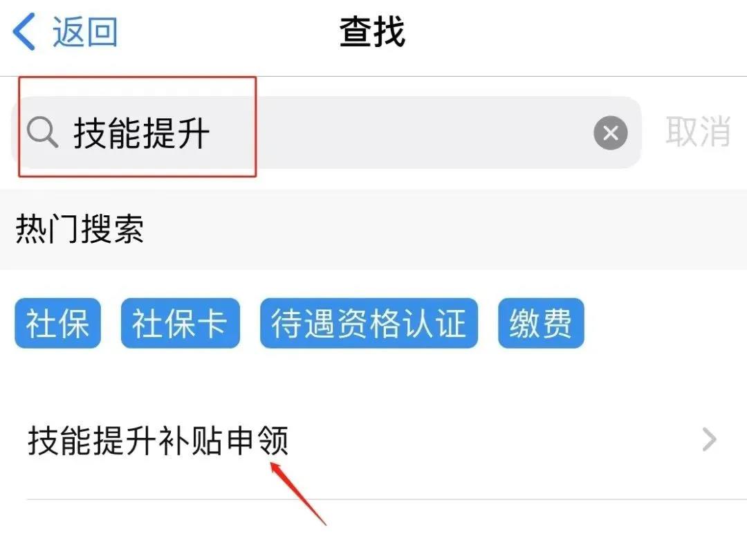 3、在搜索欄中輸入“技能提升”進行搜索,并點擊“技能提升補助申領”;