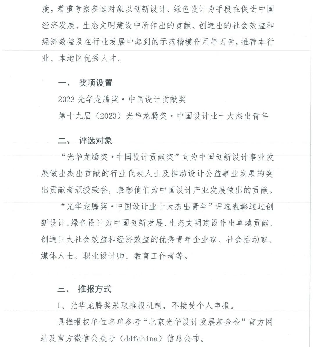 “光華龍騰獎(jiǎng)·中國(guó)設(shè)計(jì)貢獻(xiàn)獎(jiǎng)”參評(píng)年齡為45周歲(含))以上的中華人民共和國(guó)公民(含港澳臺(tái)同胞)。