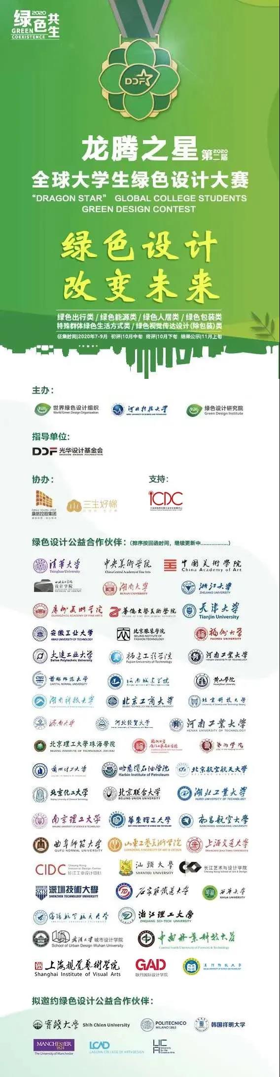 大賽簡介2020第二屆“龍騰之星?全球大學生綠色設計大賽”是由世界綠色設計組織、河北科技大學、北京光華設計發展基金會、國際設計聯合會、綠色設計研究院等聯合發起,康旅控股集團協辦,各國高校、行業組織、媒體機構等共同參與的全球大學生綠色設計類賽事。本屆以“綠色?共生”為主題,旨在讓更多青年人加入到可持續發展進程中,在全球范圍內倡導和傳播“綠色設計”理念,凝聚當代大學生“綠色設計”智慧,致力于以“綠色設計”手段引領生產方式、生活方式、消費方式變革,實現人與自然融合共生。